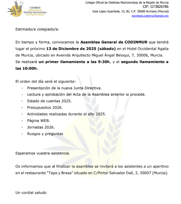 Tras la Asamblea se invitará a los asistentes a un aperitivo en el restaurante “Tapa y Brasa”.